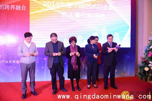(右起)中共静安区区委、常委、副区长邓小冬,人大副主任严俊瑛,区文化局局长张爱华,上海文交所副总经理潘乐群,东方网总裁助理、上海东方网文化产业发展有限公司董事长高彬翔共同揭晓“2014年度中国艺术品金融化五大事件”