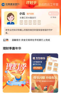 客户可在线就近预约客户经理了解或购买基金、保险、国债、银行理财等投资产品,由专业的客户经理帮忙制定资产配置方案,提供专业的理财服务。客户在建设银行“云工作室”还能通过财经资讯、投资学堂、在线直播、趣味活动等板块实时了解财经大事,丰富财商知识。