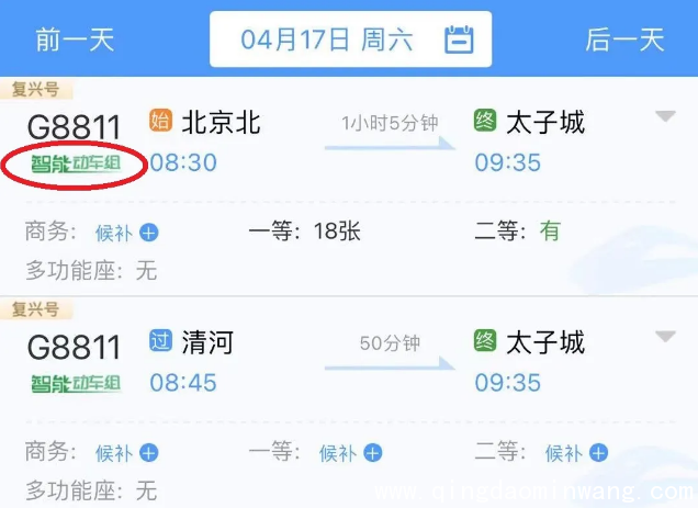 △在12306上购买京张高铁车票时,该车型车次下方会有绿色“智能动车组”字样