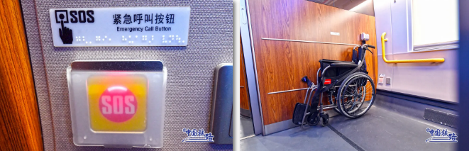 全列覆盖免费高速Wi-Fi,旅客在旅行途中可以随时使用电脑办公、手机娱乐。车厢内设有大件行李存放处、无障碍卫生间等设施,并在残疾人座位区配备轮椅固定装置、SOS按钮等。