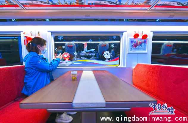蓝色的灯光、洁白的雪花、绚丽动感的车窗贴纸……在京张高铁服役的复兴号智能动车组将冬奥元素、运动精神和铁路文化融为一体。
