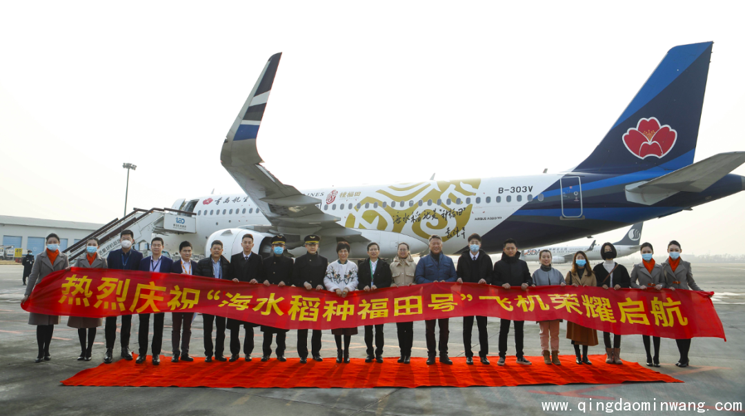 印有袁隆平院士题字的青岛航空“海水稻号”飞机启航