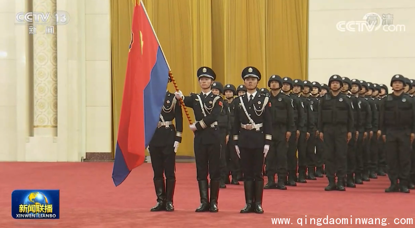 人民大会堂北大厅气氛隆重热烈。红色背景板上,“中国人民警察警旗授旗仪式”字样格外醒目。300余名身着警礼服、特警战训服的人民警察身姿挺拔、精神抖擞,整齐列队。