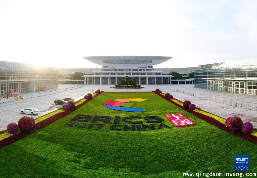 这是布置在厦门国际会展中心广场上的金砖国家领导人厦门会晤主题花坛(2017年8月24日摄)。新华社记者 姜克红 摄